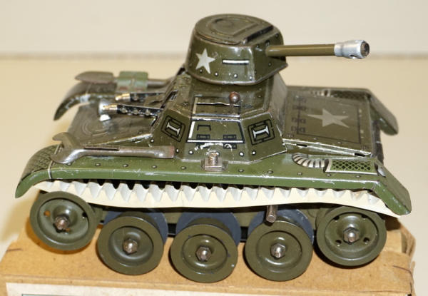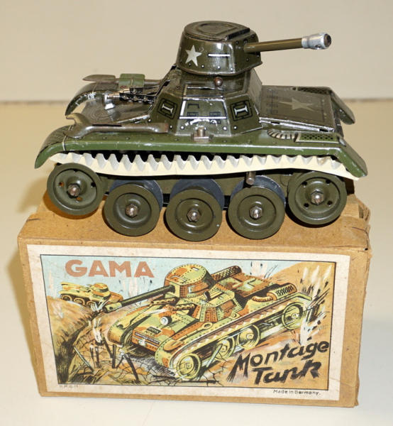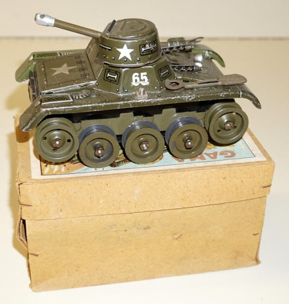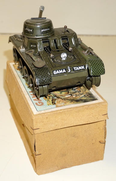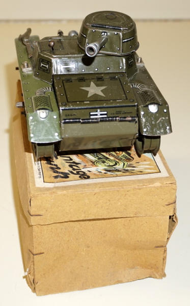Tin-windup, made in US Zone Germany, missing the tracks, did not test, does have the two original tools, some light scuffs and scratches, 6.5" long, one "fender" might have been replaced, paint doesn't quite match, 2pc box is pretty clean and nice