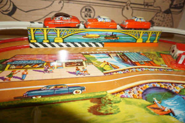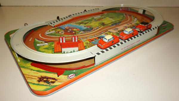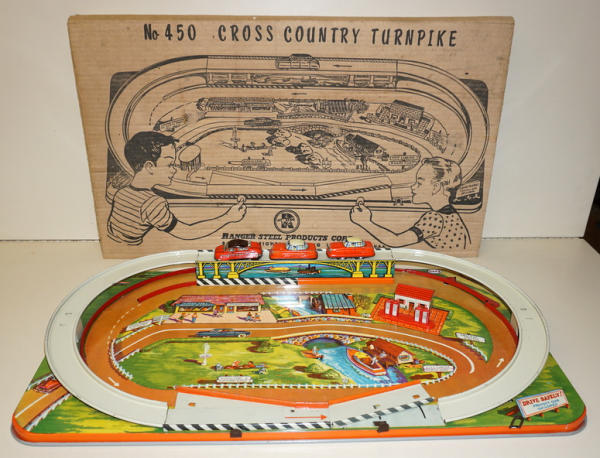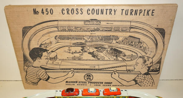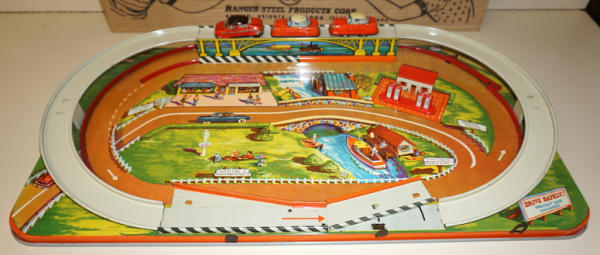 Beautiful Tin-Litho Set w/ 3 original cars, Board is 27"x15", clean and nice, Cars are each 3" long with some general wear and don't work quite like they should; box is complete and very good condition with some normal wear