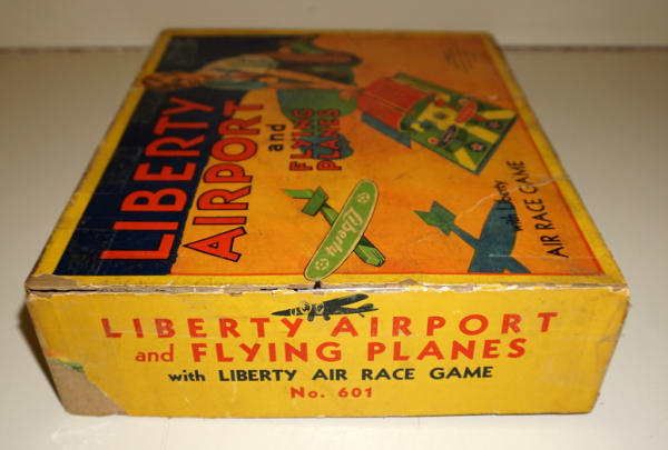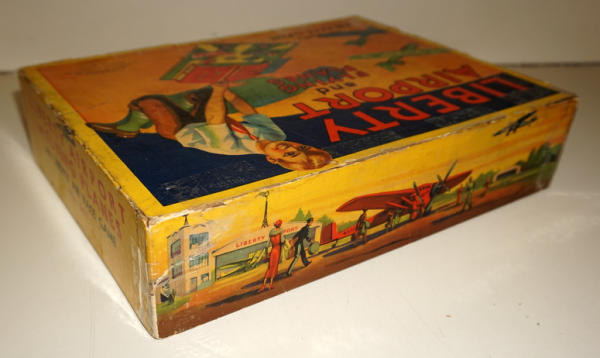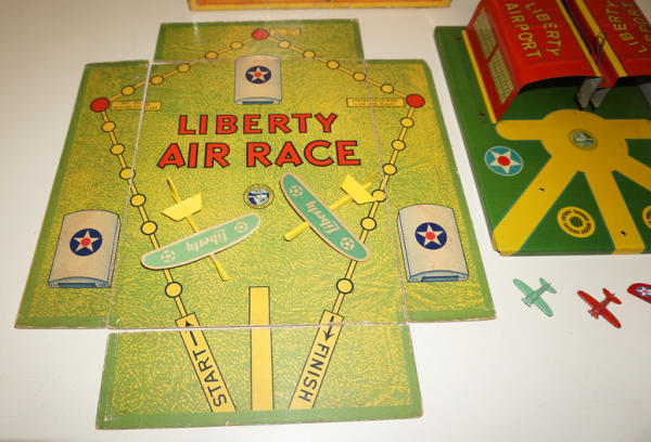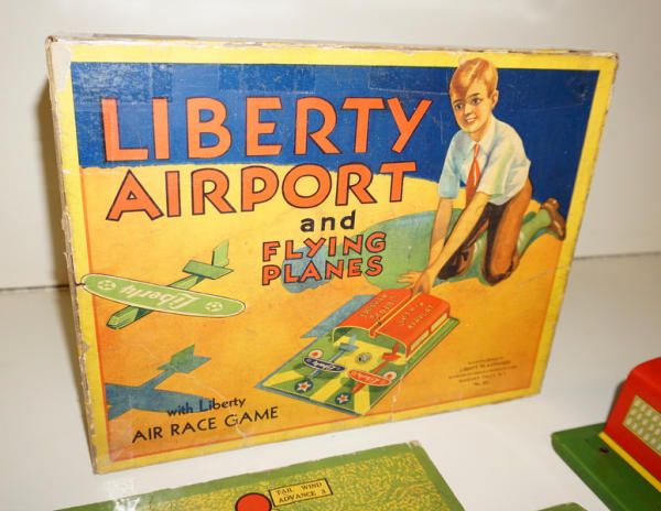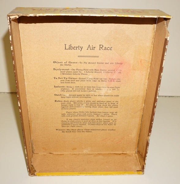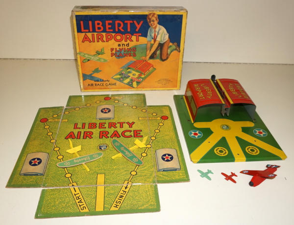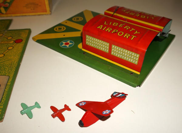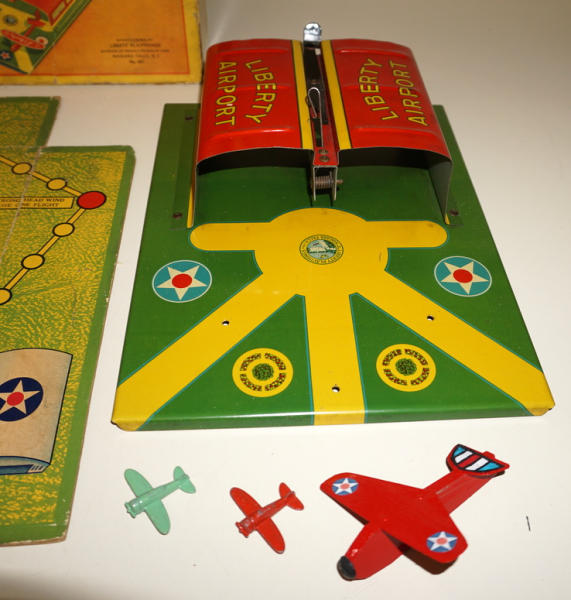 Great 1930's Set; Tin-Litho Hanger with spring-load mechanism to launch the planes; 11"x9" main base, includes the original game board too; box is complete with good color, but heavy tape and wear to the edges; Not sure, but I'd guess 1930's era set