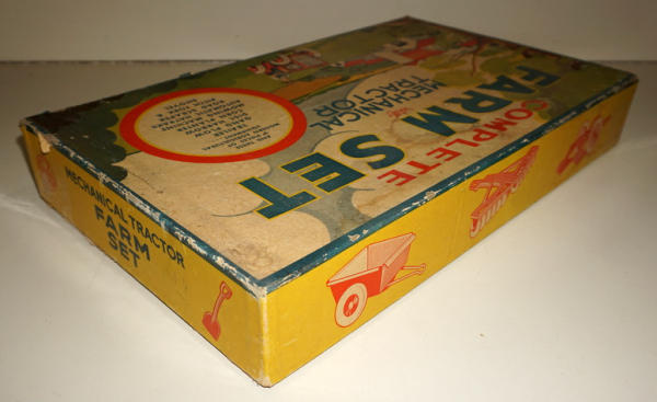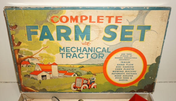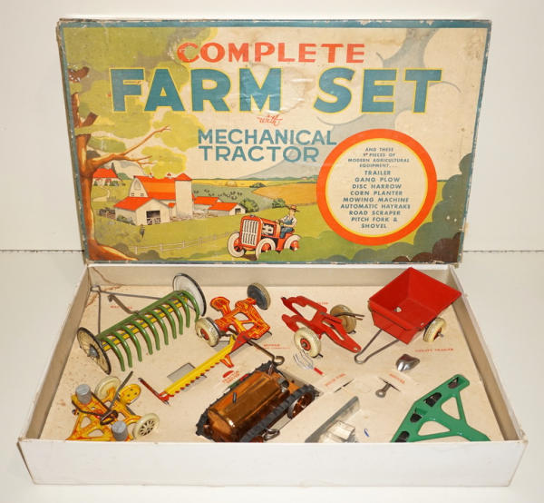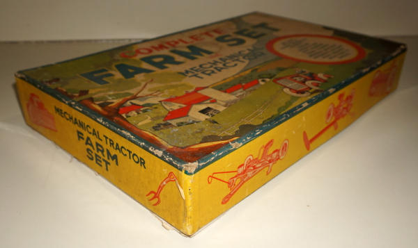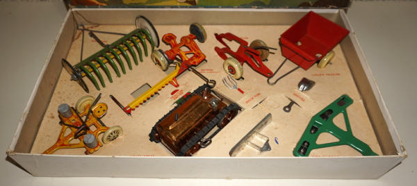 Awesome Set, comes with the small gold-tone crawler and all the implements, looks to be 100% complete even with the pitch fork & shovel; box is complete, some discoloration and general wear, tape on the corners, nice box liner, neat piece for the Farm set collector