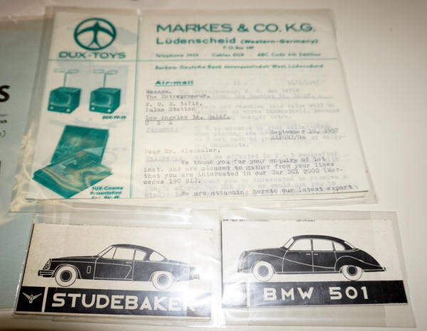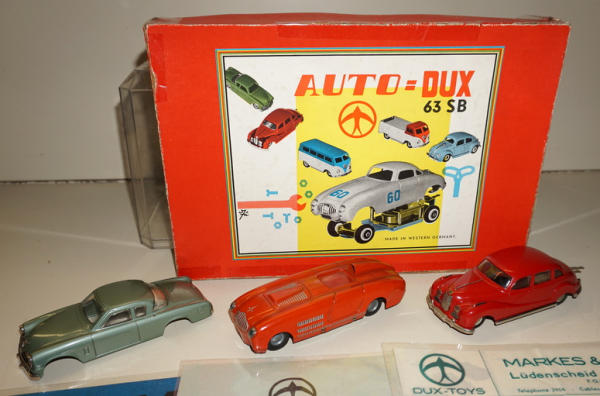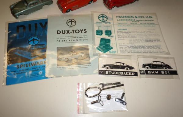 Great set, built in Western Germany; includes 2 complete cars plus the '53 Studebaker body that can be swapped out; comes with a note that says the original key does not work, but a different one included does; includes instructions; box has tape on the edges, but overall clean and nice;