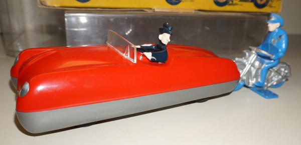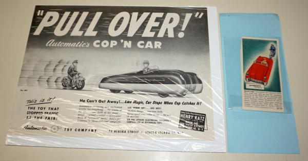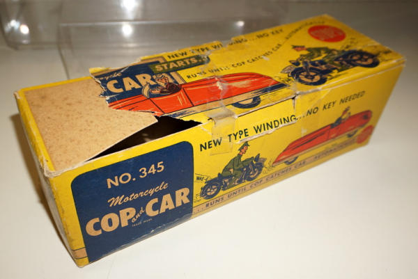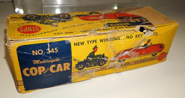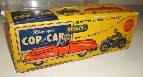 heavy plastic, 12" long, motorcycle is attached to a pull string and makes the car drive and the motorcycle "chases" while it winds up the string; Box is clean and nice, works like it should; Box is there, one side displays fine, but overall is poor condition with heavy damage and tape; includes 2 original advertisements for the toy too