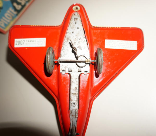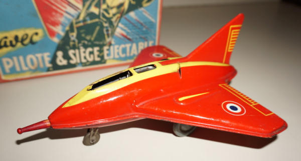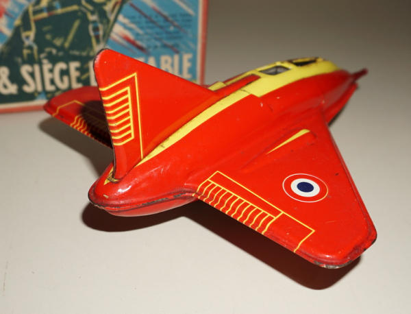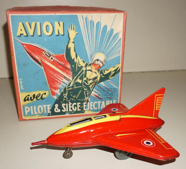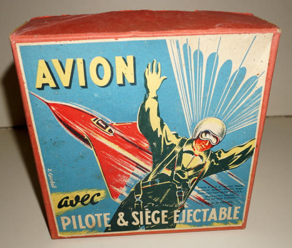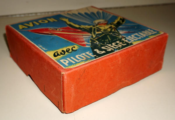 plane is 9" long, missing the ejectable pilot and has some general wear; great graphic 2pece box with some general wear; better box than toy I think