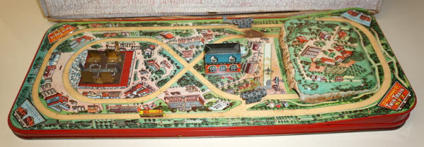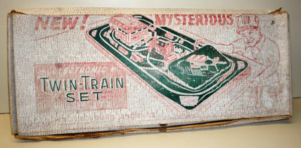 incomplete, only includes one train and also missing the train station that was used for battery box cover, lots of graphics and detail, 28" long, did not test; includes the box; box is complete, but has heavy wear
