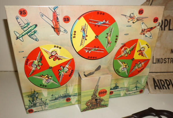 board is clean and nice with great plane graphics, 12"x16", gun is cast iron & tin; I'm not 100% sure this is the correct gun, not marked, but was found with the set; box has pretty heavy wear, but included