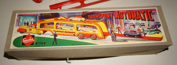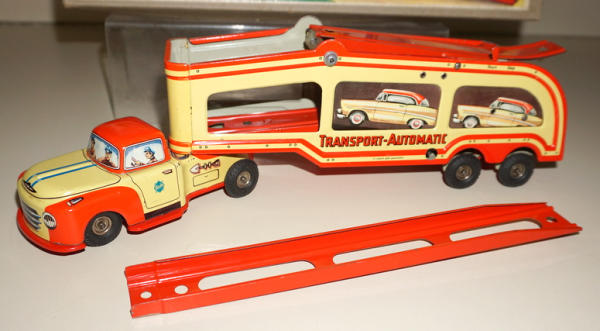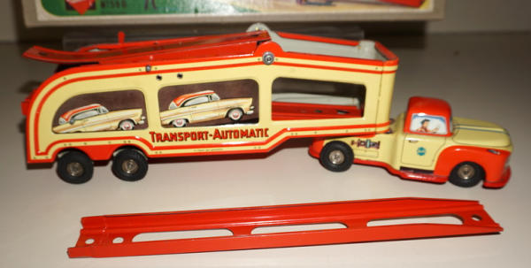 14" long, beautiful Tin-litho, key wind, made in Western Germany, 2pc box is also nice, great looking toy; no cars included, has the ramp