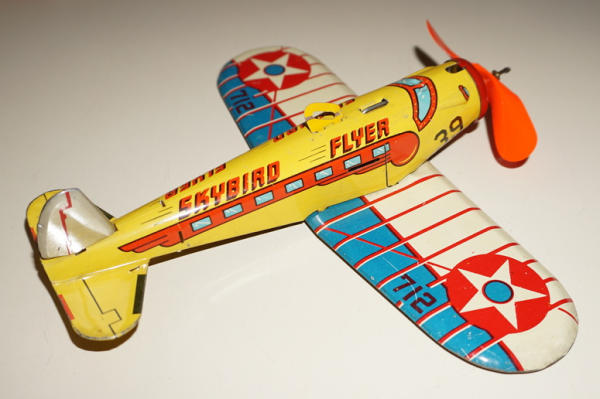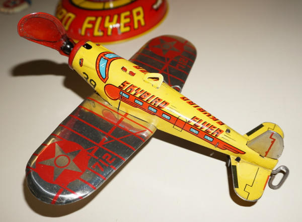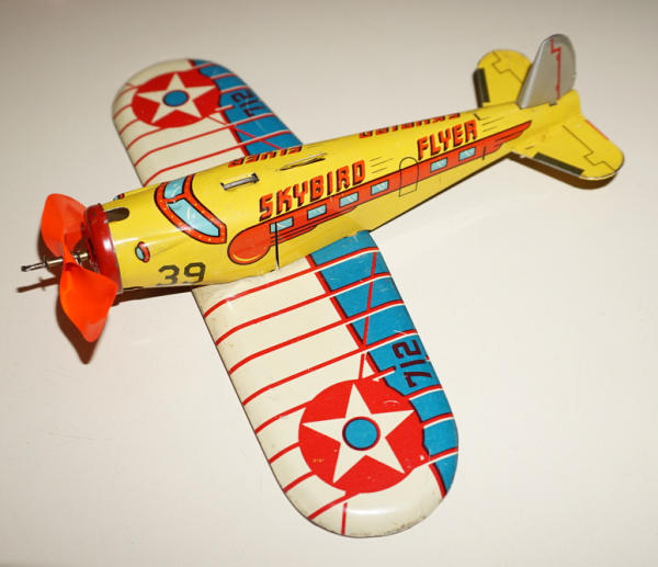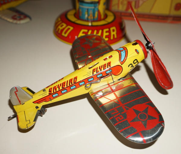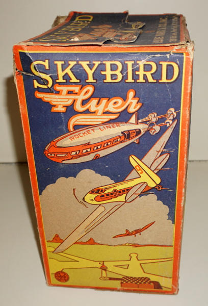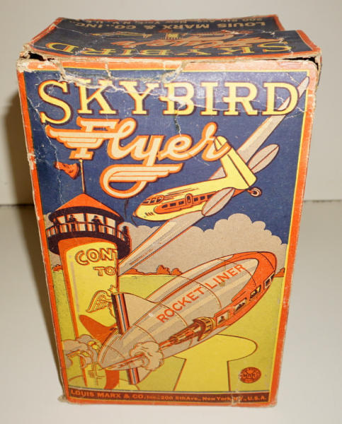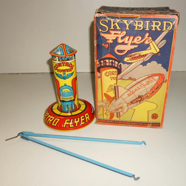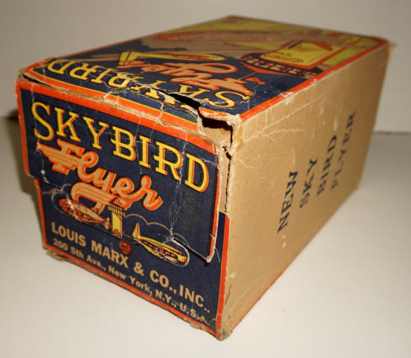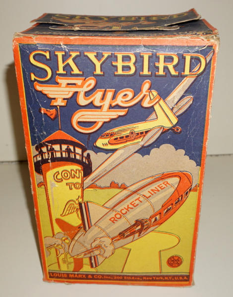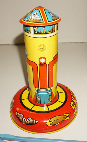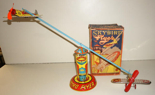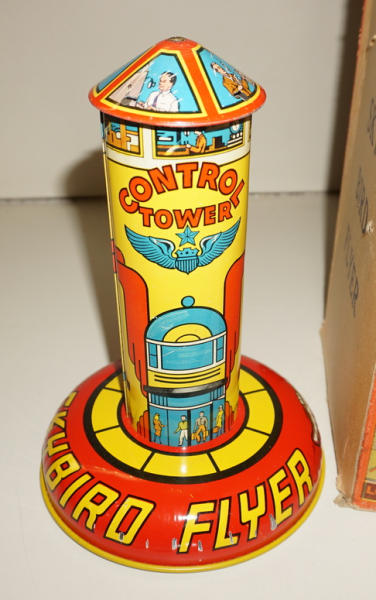 Toy is clean and nice, tower is 9" tall, each plane has about an 8" wingspan, windup works like it should; box is very colorful, has some damage around the top and general wear, overall a very beautiful original Tin-litho set