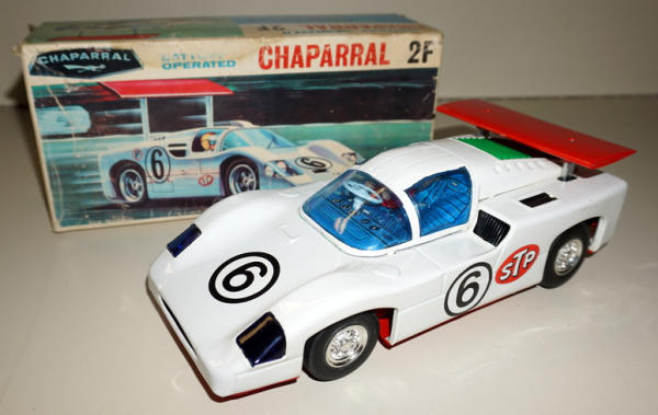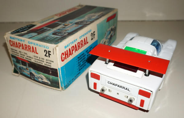 11" long, tin w/ plastic chassis, made in Japan, toy is clean and near mint, did not test but battery box is clean, box is a 2pc box, has fairly heavy wear, but still nice and solid