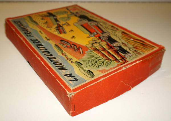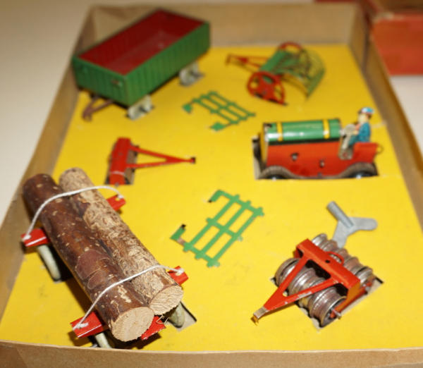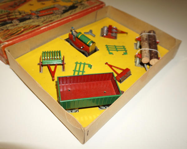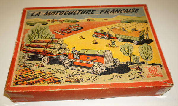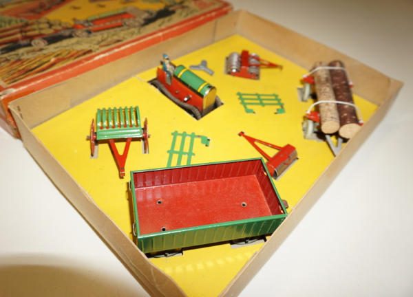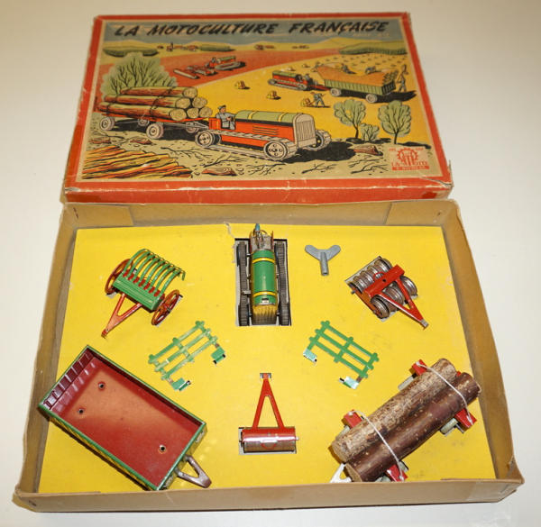 has a note with it that it was made in Germany for the French market, all toys are near mint, tractor is 3" long, original box liner, box has great graphics, some tape on the corners and some general wear, unique foreign farm set