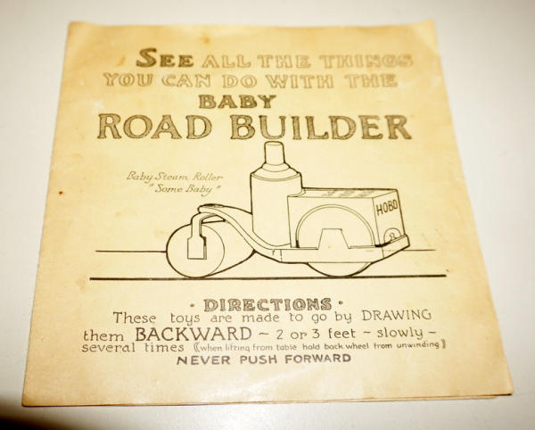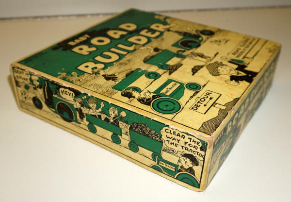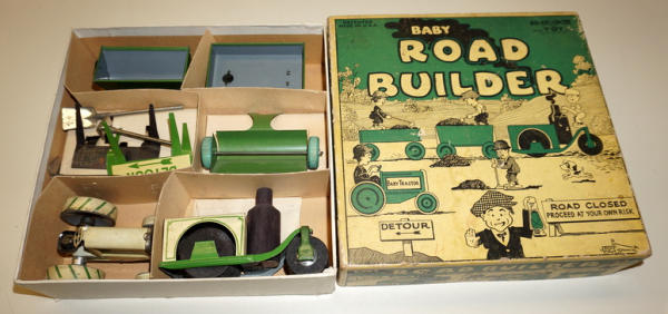 great set with the steam engine roller, implements and even the original cast iron tools, boys have minor wear, but overall all clean and nice, box is 8.5"x8.5", original directions sheet, some general wear