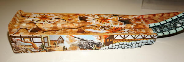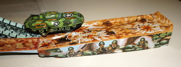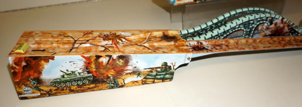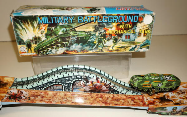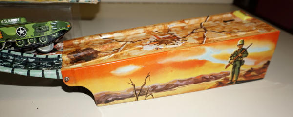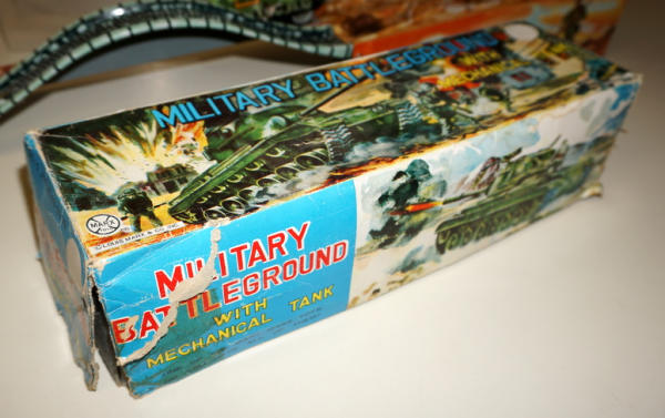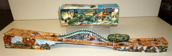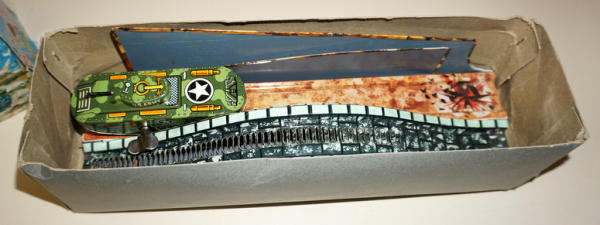 Neat set, 3-section track unfolds and includes a key-wind tank; toy is near mint with super graphics; box has fairly heavy damage and wear