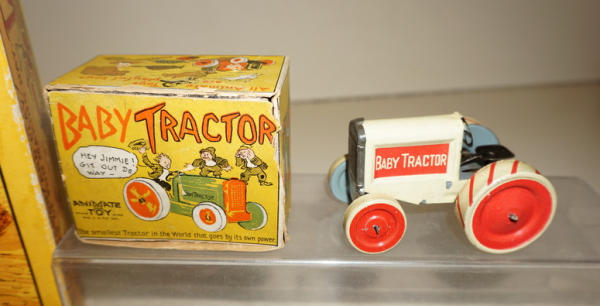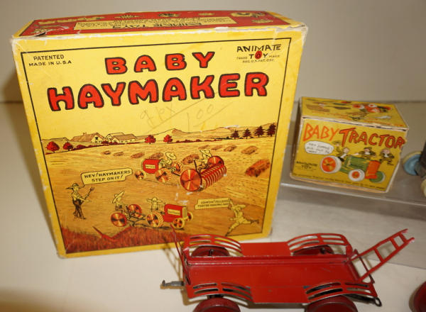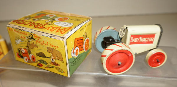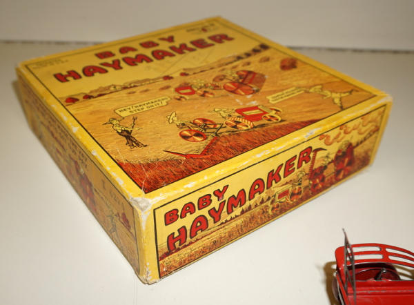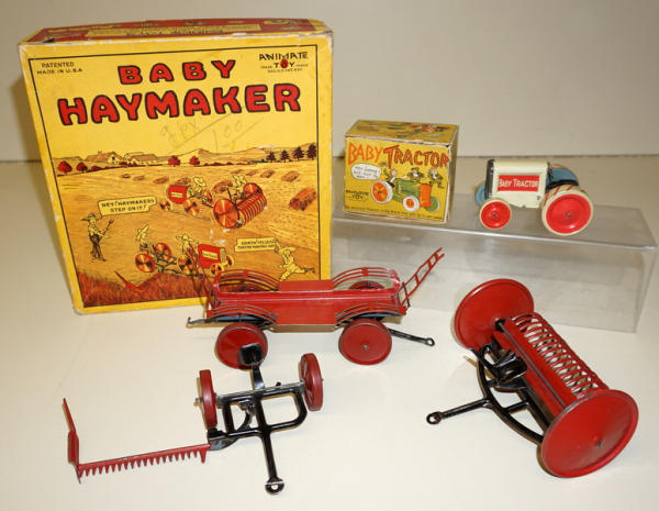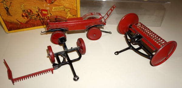 Great Set, 3 implements & Tractor, has the original small graphic box for the tractor too that I have never seen before, toys all look to be nice and near mint, box is also nice with some general wear