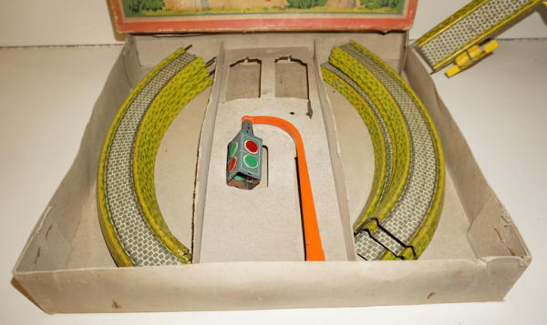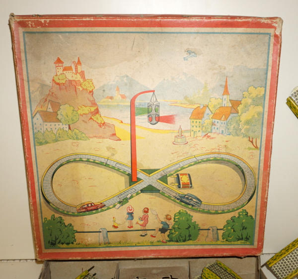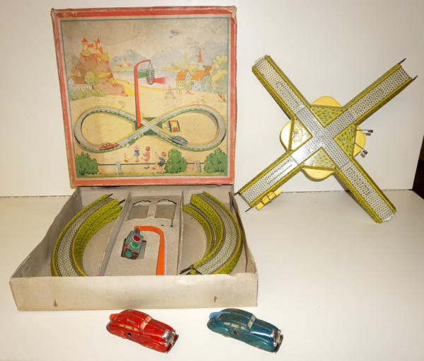 Large Set, looks complete, cars have some general play wear, 2pc box is 16"x16"; we have 2 of these in the auction, the one earlier is the nicer of the two sets