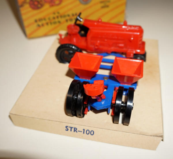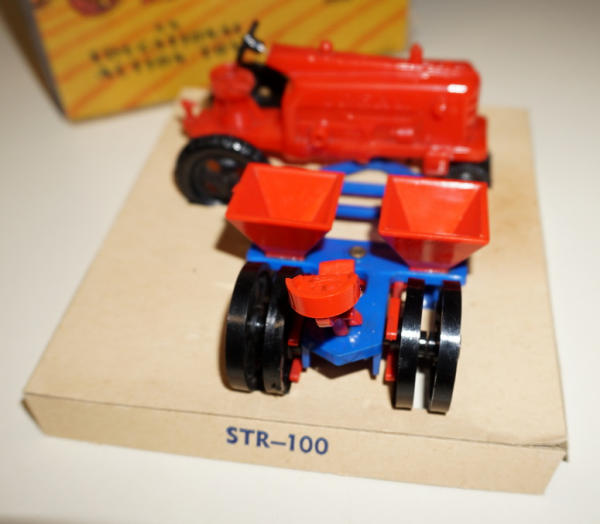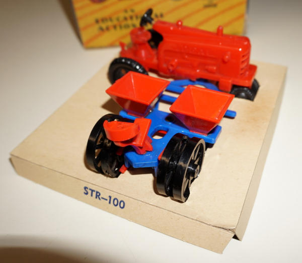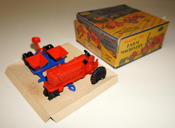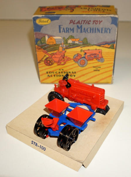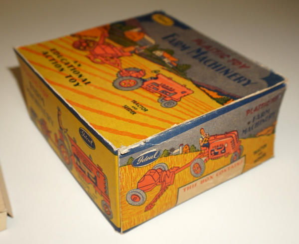 Hard plastic, tractor is about 4.5" long, toys are mint, box has the liner, box is nice with some general wear