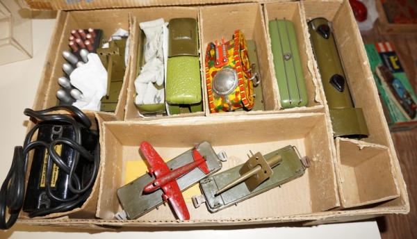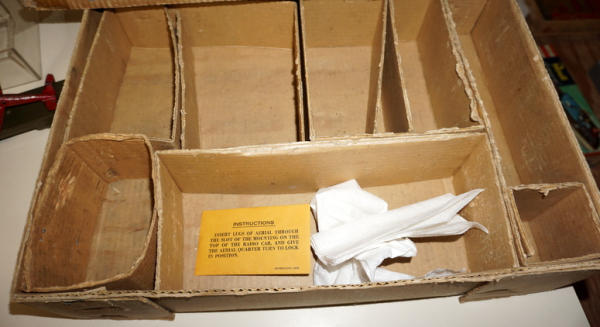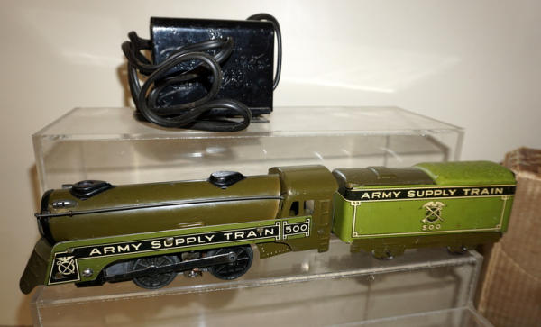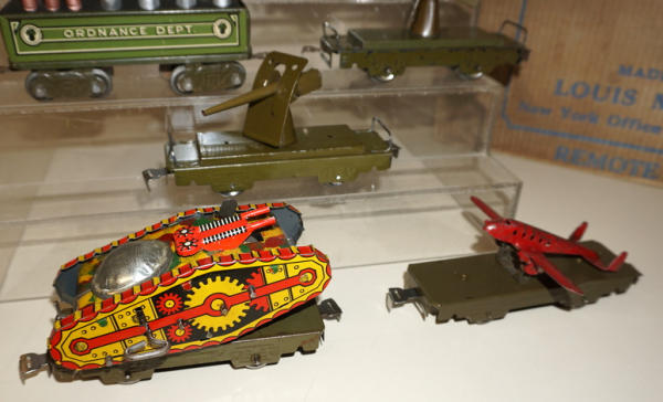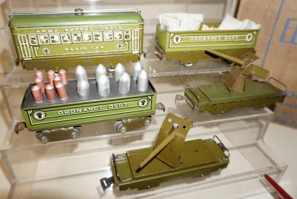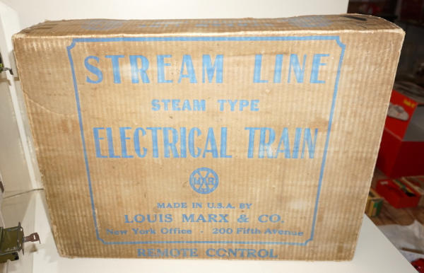 engine with 8 cars, transformer & a pile of Marx Track (not shown); toys are all very nice, not mint, but nice, did not test, looks pretty complete, but no guarantees; box is complete but fairly heavy wear; very unique and desirable MARX train!