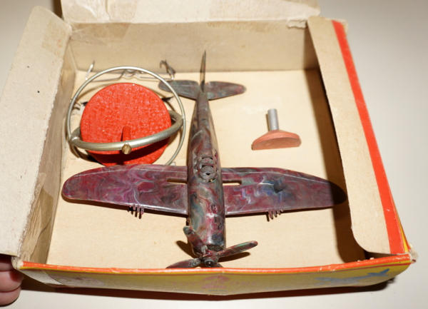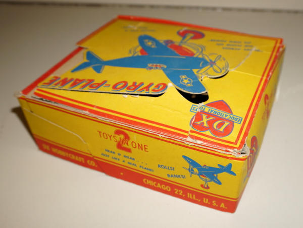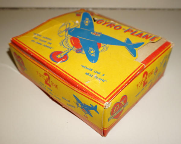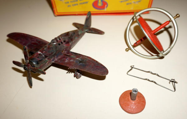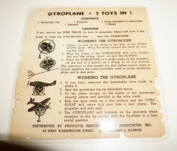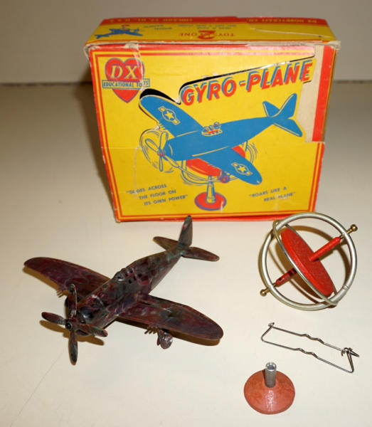 plastic plane that sits on top of a Gyro-scope, plane is 6" long and looks good, looks to be complete, box has some damage and missing a piece on the lid