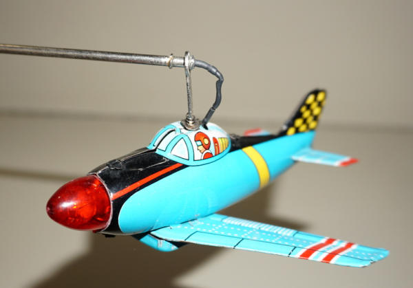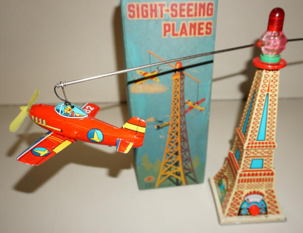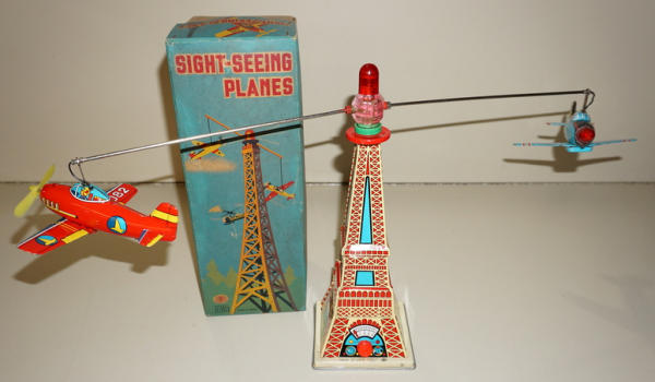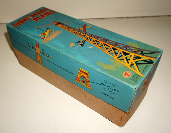 11" tall tower with 2 planes that spin from the top, did not test, but battery box is clean, 2pc box is very good with some general discoloration; made by Modern Toys of Japan