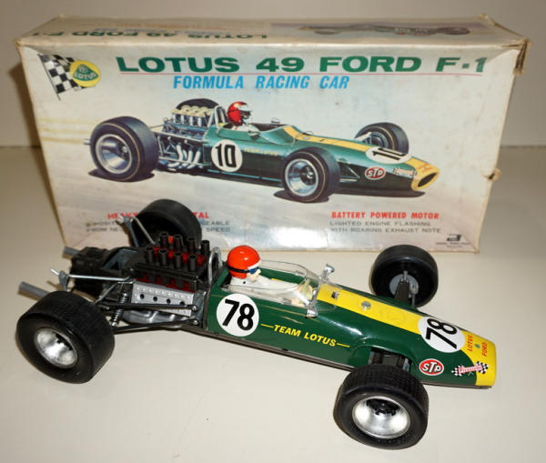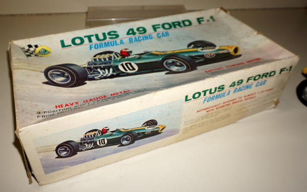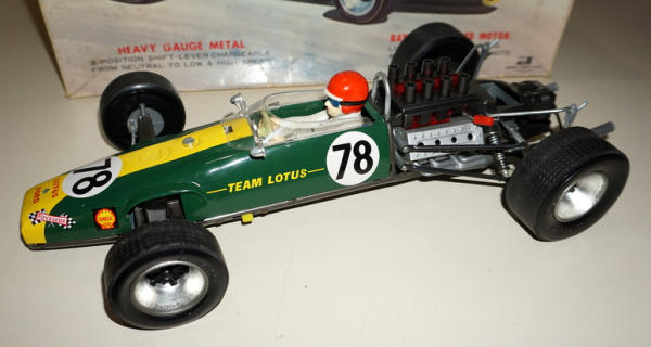 16" long, mostly tin with some plastic parts, clean and nice, did not test, box has some crushing and general wear, great companion car to lot #120