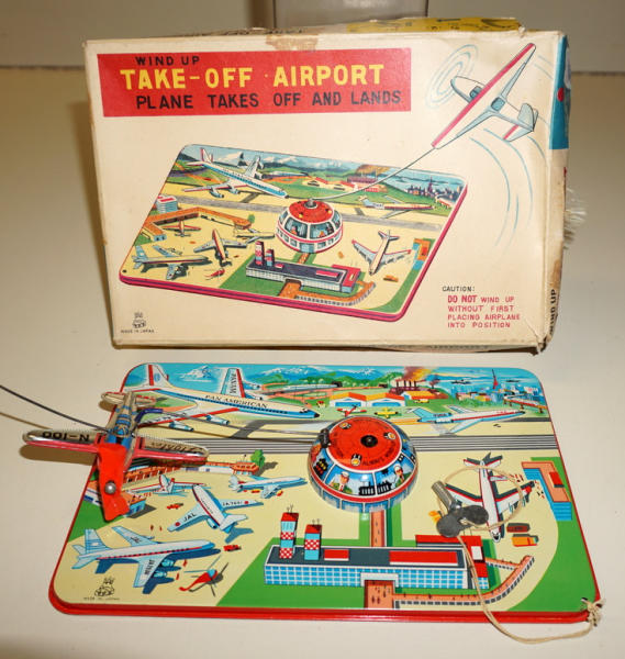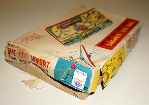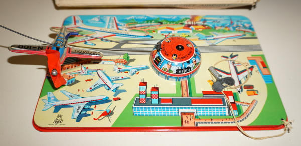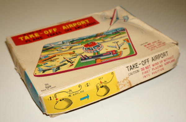 Great tin-litho color, works like it should, 9"x6" base, box is complete, but has heavy wear to the bottom and edges