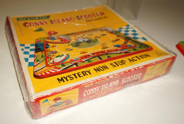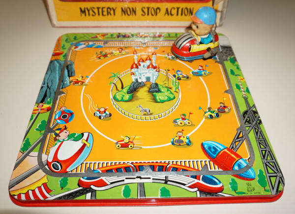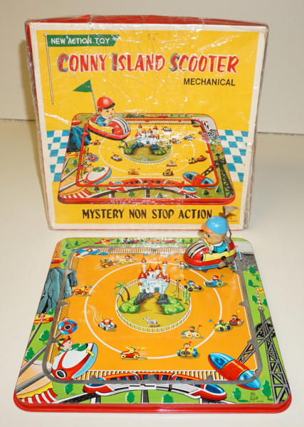 board is 10.5"x10", great color, windup works, box has some damage and general wear, wrapped in plastic to protect