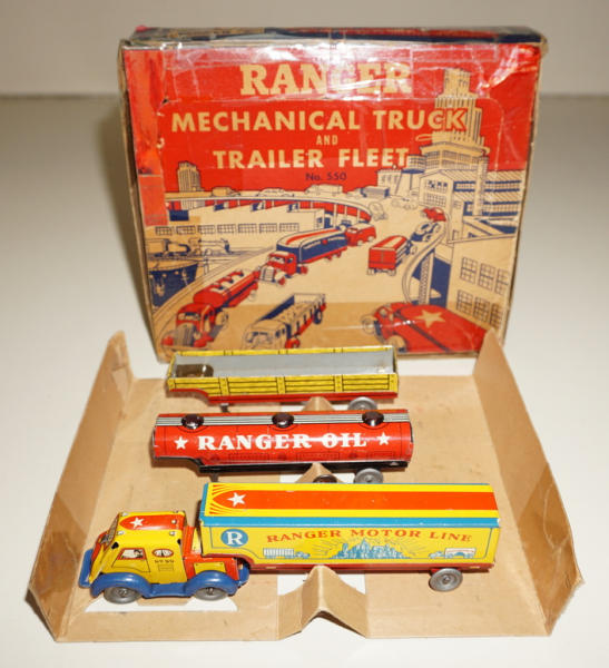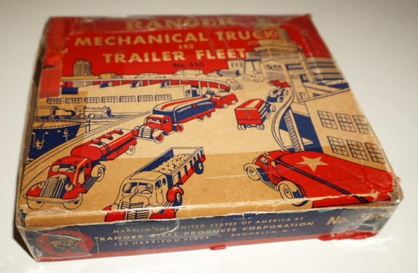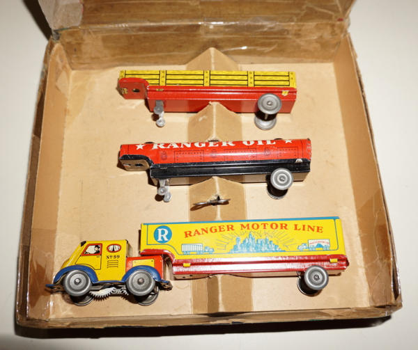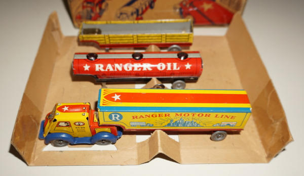 Great little set, 1 truck w/ 3 different trailers, assembled truck is about 6" long, toys are all mint to near mint; box is complete, but has a lot of tape on the top and edges