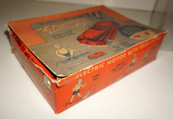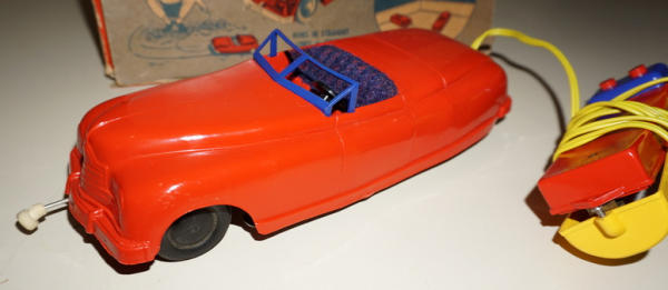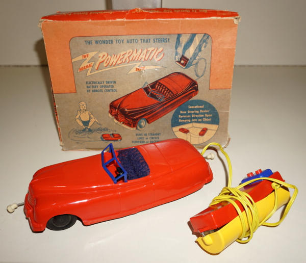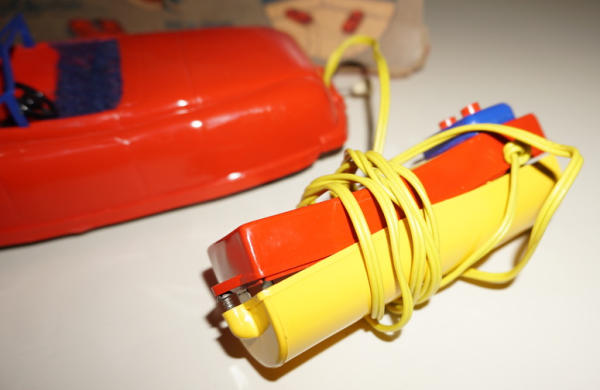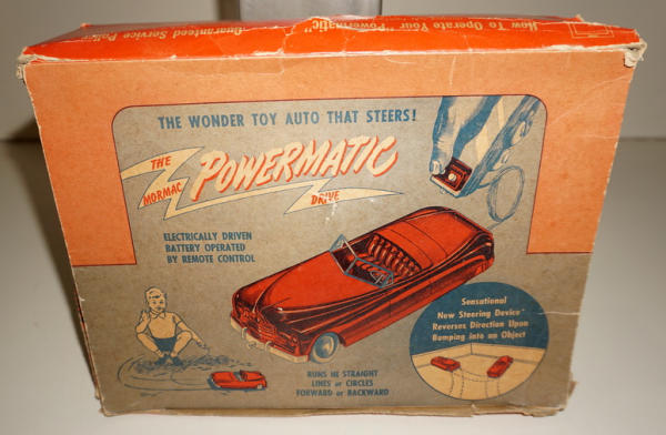 9.5" long car, works good, but battery box remote is worked, owner says to put rubber bands around it to hold it together, box is complete, has the liner, but has heavy wear
