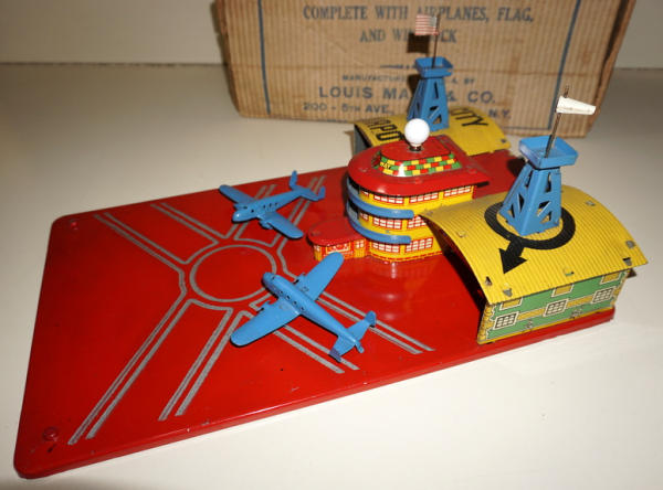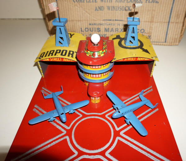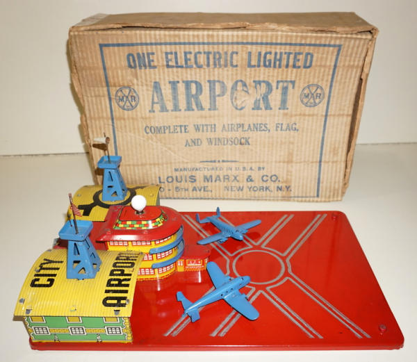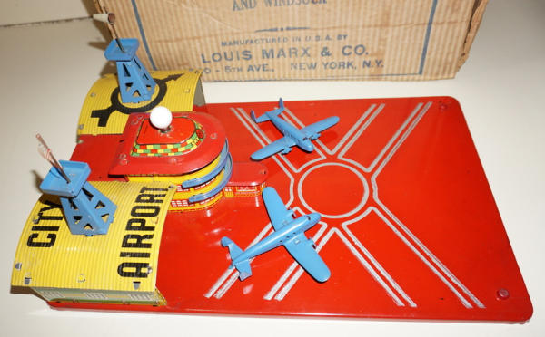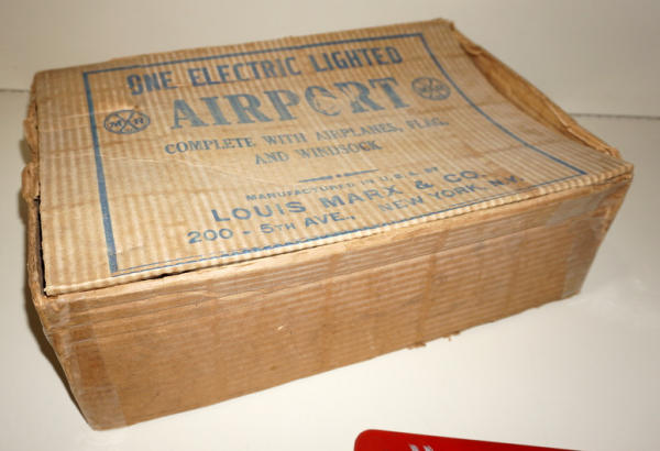 Great Marx set, base is 17"x11", toy is clean and nice with some light ear, box is complete, but heavy wear and has some tape on it