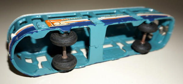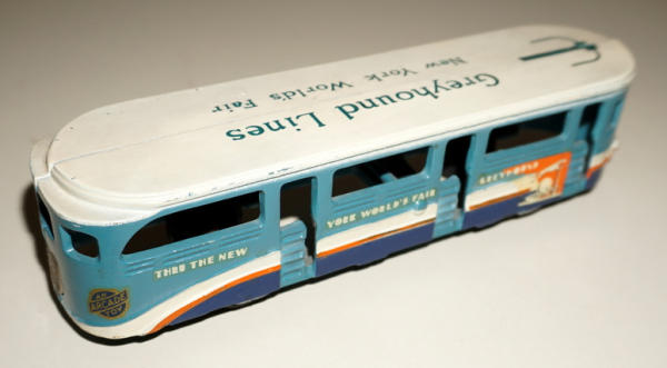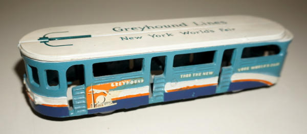 8.5" long; I've looked pretty hard at this bus and I think it is an exceptionally MINT original; decals are correct, colors are correct, screen printed printing on the top; nice enough for a box--wow!