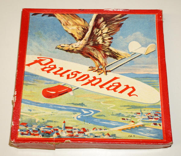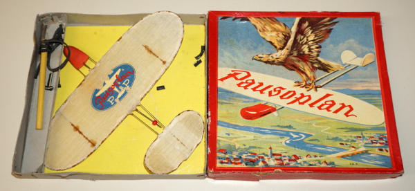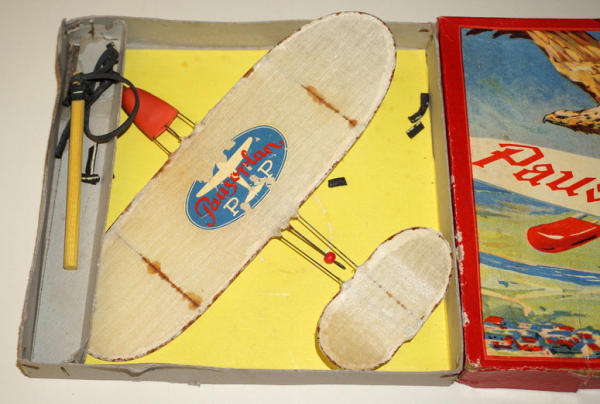7.5"x8" airplane, light wire w/ cloth wings, great graphic box, box has some general wear