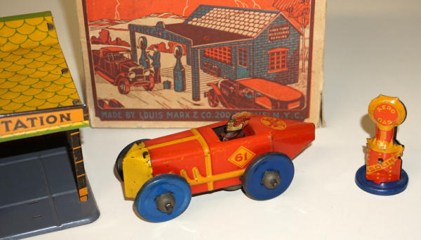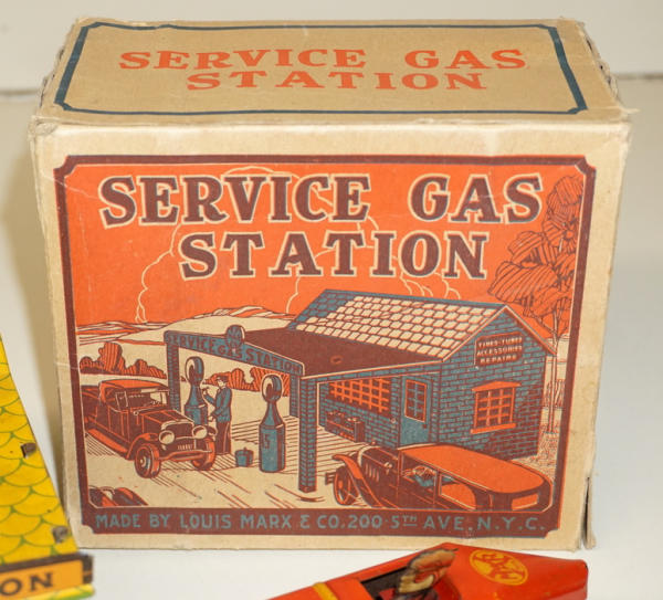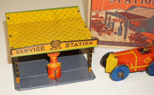 6"x5"x3.5" gas station, original Marx Race car, toys are all very nice with light wear, box is complete with some general wear mainly to the edges