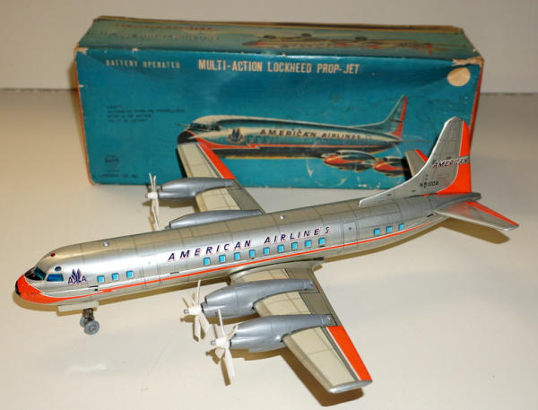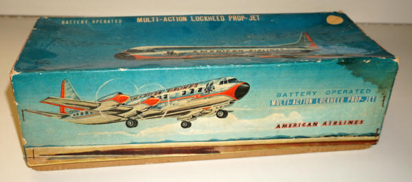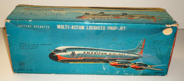 Tin battery op by Linemar of Japan, plane is 15" long with 14" wingspan; looks to be near mint toy, I did not test, but battery box is clean; box is complete, has some crushing and general wear, box rates 7 condition
