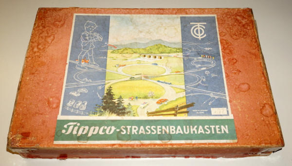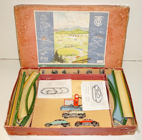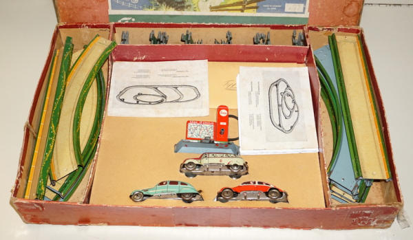 3 cars, original ESSO Gas pump plus a lot of road & track; looks to be complete, but I won't guarantee, large 2pc box has heavy wear, box is 19"x12", has some water spots on the lid and heavy wear; toys are nice with some normal play wear