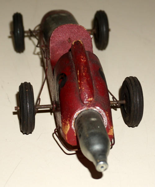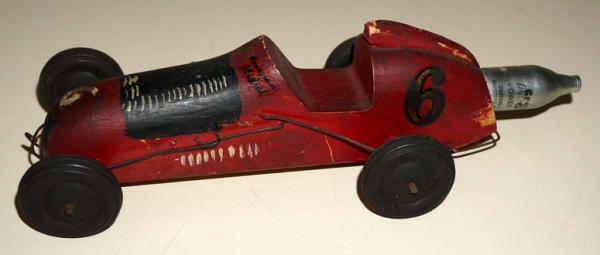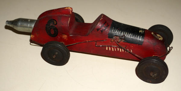 9" long overall, great folk-art look, similar to a Boy scout Pinewood derby car except has a CO2 Tank to make it go, neat piece