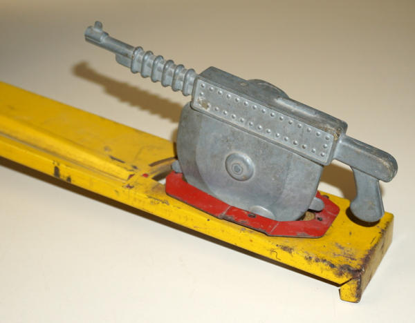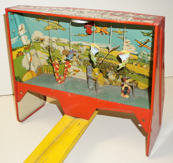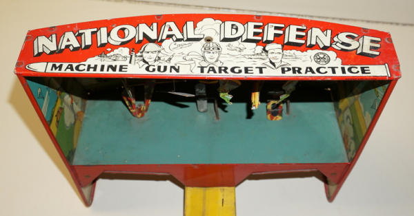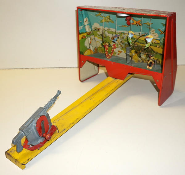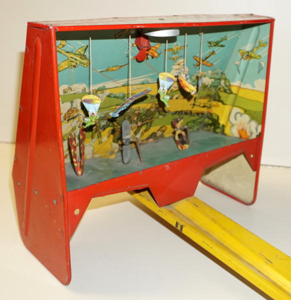 11" tall, 20" long, 13" wide; no bullets included, looks to be pretty complete with all the hanging targets and mounted spinners on the bottom, super graphics, does have some play wear