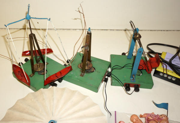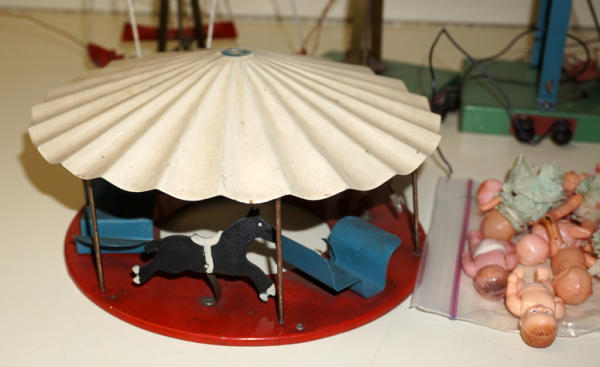 large set, Merry-go-round is 9" across, some general play wear, includes some little plastic kids to display, did not test, needs a cleaning, all to go