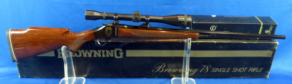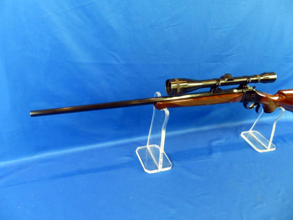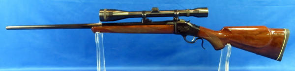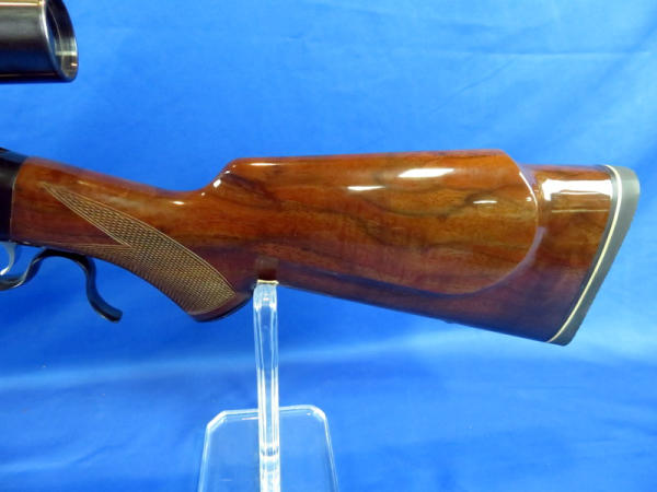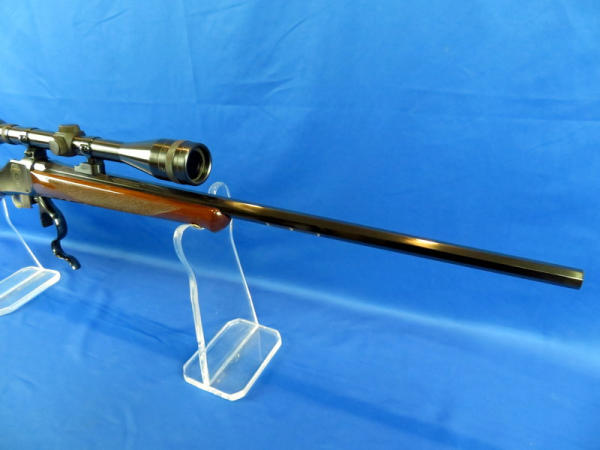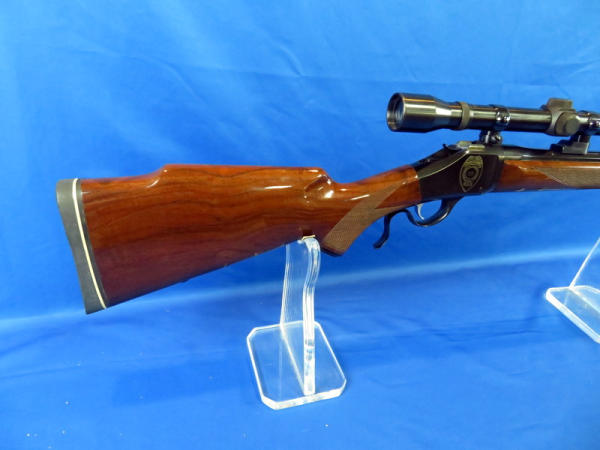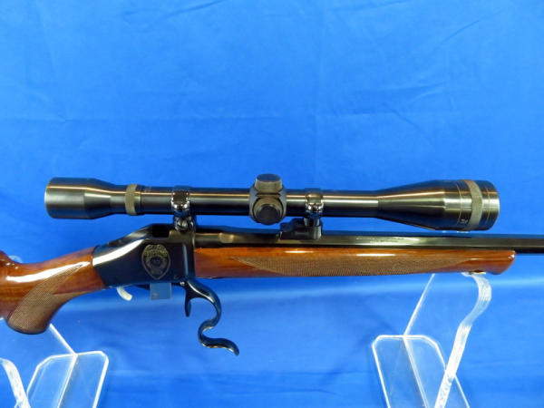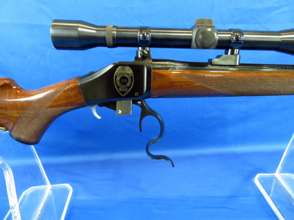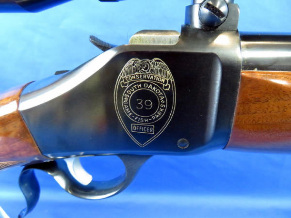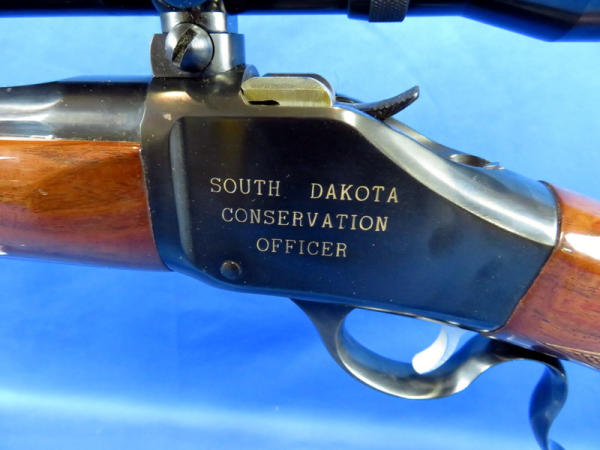 26" Oct. BBL; Engraved receiver w/"South Dakota Conservation Officer" & Badge! Smooth action; terrific shape w/tremendous Day 1 gloss on the wood & bluing! Older Leupold Vari-XII 2x7 scope w/original box; gun has original box; these are much like the Ruger No.1; SN#05446RT147