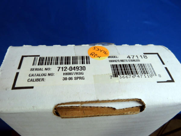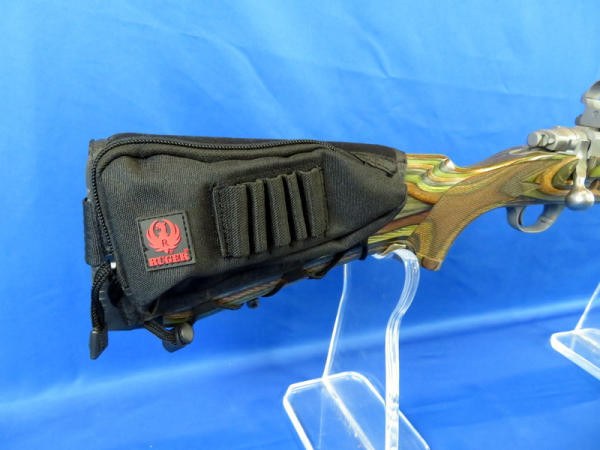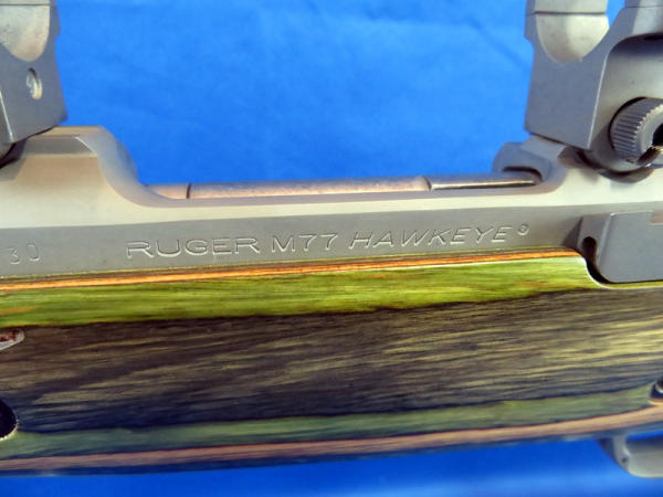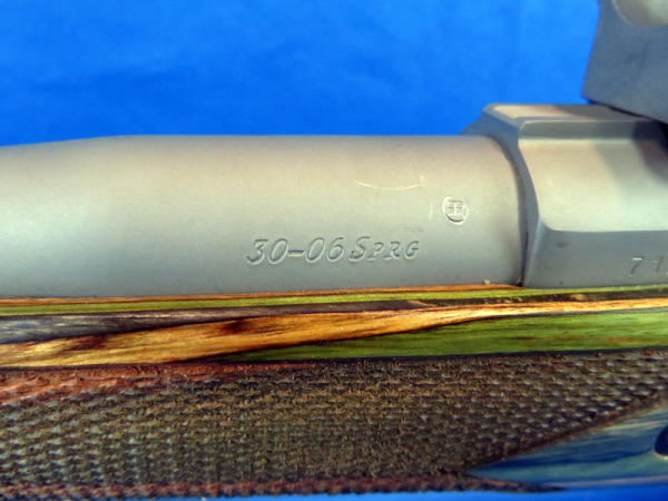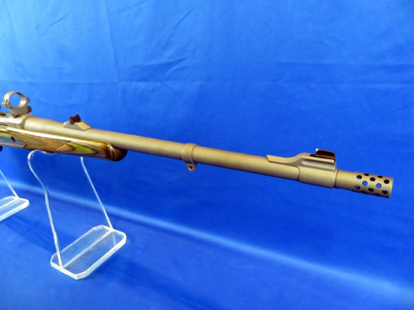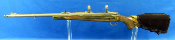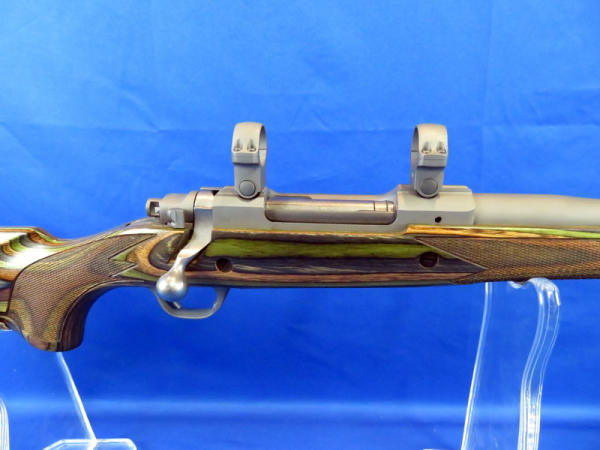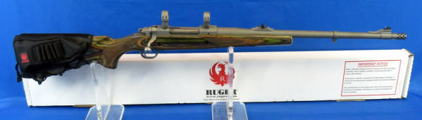 21" flat grey barrel w/muzzle break; Ruger cheek pad on butt; green wood grain laminate stock; smooth action; scope rings; original box; appears mint & unfired; SN#712-04930