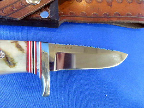 handle made of Merino Ram Horn; Blade is stainless steel 154CM Rc.60 & 3.75" long; leather sheath has alligator skin inlay; file work on top of blade; very nice