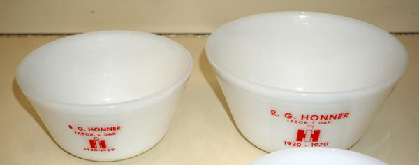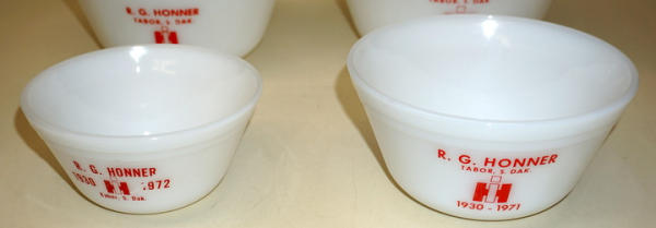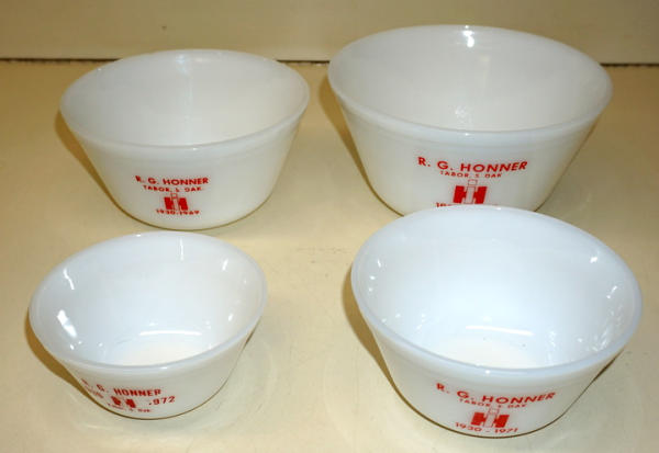 largest bowl is 8", all near mint, smallest one has a scuff in the logo, very hard to find this full 4pc set in nice condition, sells 4x the money