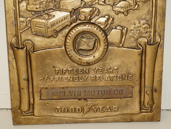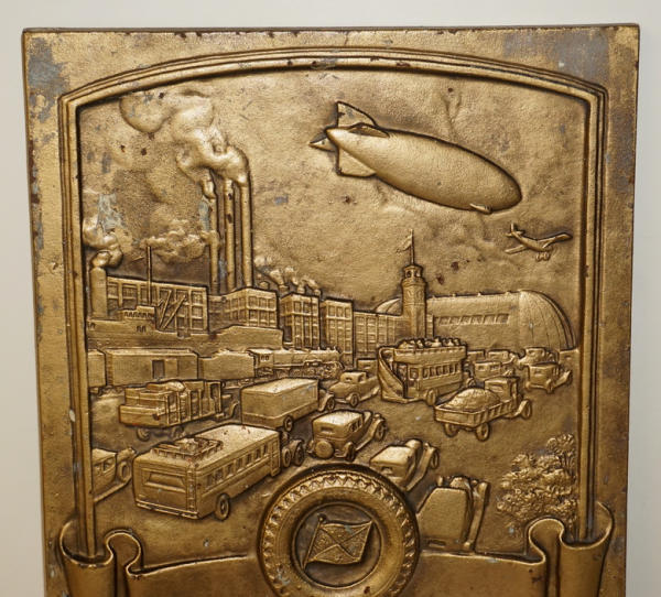 Great piece, very heavy, 12"x17", great mix of cast-in vehicles--Cars, Bus, Airplane, blimp & more, looks to be from 1930's or so, some general wear and age spots, rates 8 condition