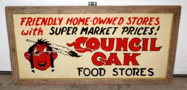 Painted tin, writing on back says went out of business in 1958, 46"x23", has a large scratch through the middle, still unique