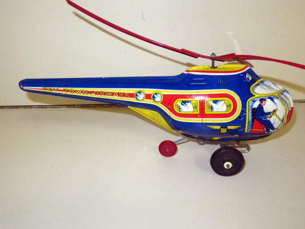 wind-up is loose but can't get it too work properly; toy has minor play wear but overall bright colors and great graphics; box has one flap in tact and another one loose, otherwise missing the rest; damage and water damage to box but still nice graphics and would still display; toy is 13" long