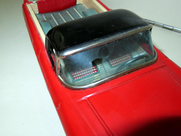 front wheels are stuck; paint is nice; has broken windshield; 10" long