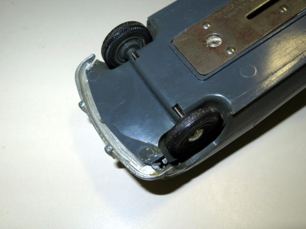 missing rear bumper and has damage on rear end; crack behind front bumper; no warping