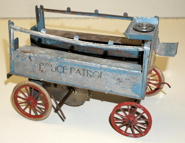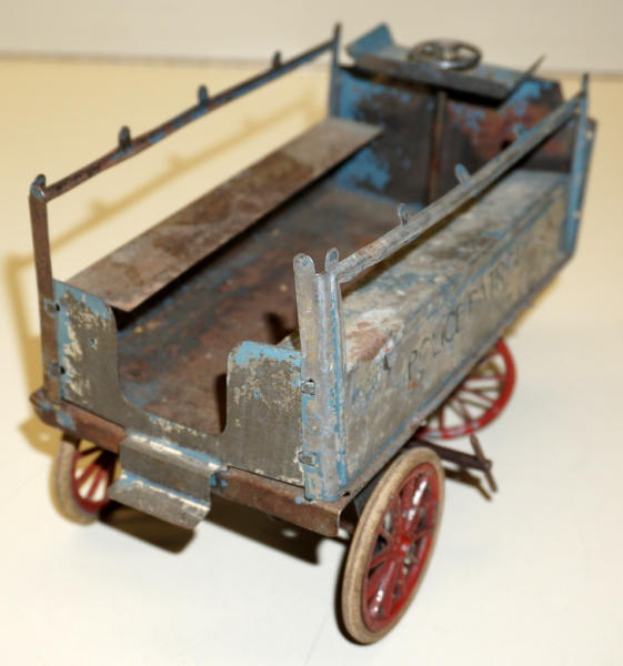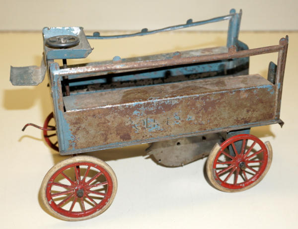 Early painted tin with very delicate cast iron axles, key wind seems to work, 8.5" long, comes with a note that this belonged to Cecil Edward in 1903