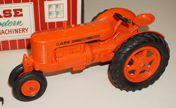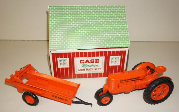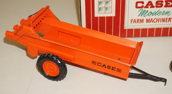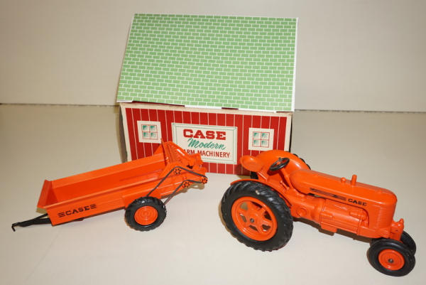 1950's plastic, tractor is fendered variation and is very nice with light wear; spreader has good top bar and very nice, near mint condition, box is very nice, rates 8.5 condition, roof is a reprint of the original, great set