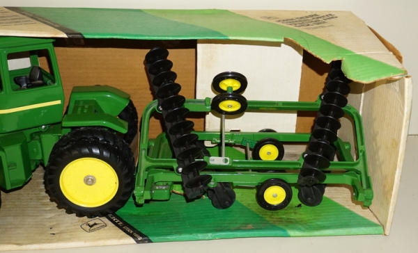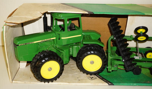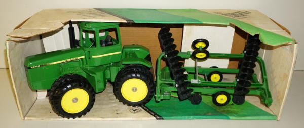 Toys are both near mint, tractor is a collector's series, box has heavy discoloration on the top, box rates 7 condition