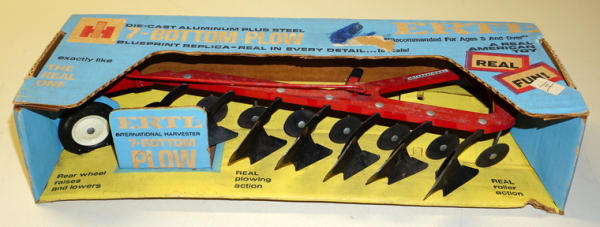 near mint toy, some light surface rust spots on the plow bottoms; box is discolored, box rates 7.5 condition