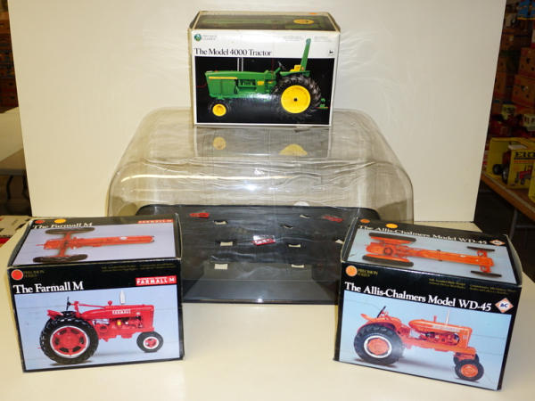 Never seen this display, 3 tractors have been displayed, but come with the original box, comes with a large plastic dome to be displayed in the store, sells as a set for one money