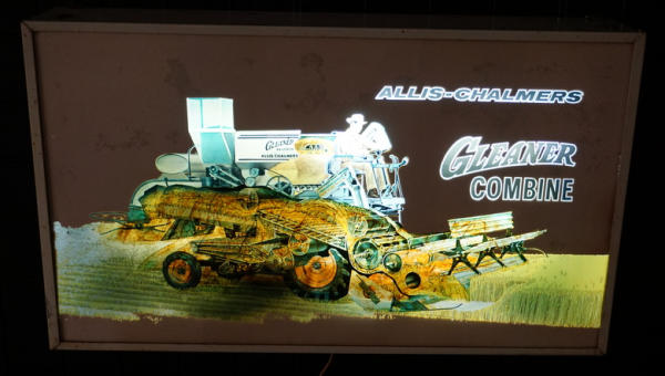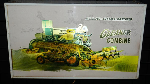 25"x15"x6" deep, metal can has some general rust and wear, face is good, lights up and has motion showing the grain going through the combine; similar to a Hamm's motion sign; classic piece of farm advertising!